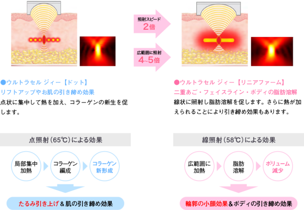 ULTRAcel Zi(ウルトラセル ジィー)は、韓国Jeisys社製の従来機種「ウルトラセルQプラス」の後継機として開発されました。ドット(点状)照射とリニア(線状)照射の2つのモードが一つのカートリッジに搭載され、交換の手間なくスムーズな照射が可能になりました。
