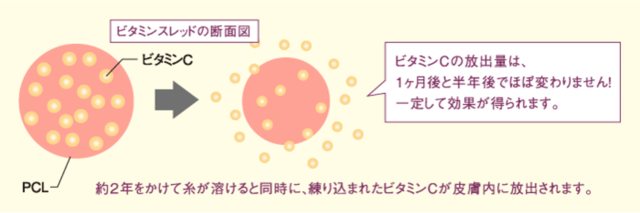 PCLは医療現場でも使用される糸で、約2年かけてゆっくりと体内に吸収されます。この長い吸収過程で持続的にコラーゲン生成が促されるため、PDO糸よりも長期間の効果が期待できます。さらに、糸から徐々に放出されるビタミンCが肌のくすみを改善し、透明感のある肌へと導きます。